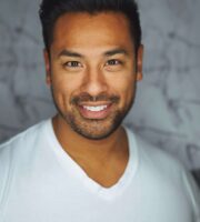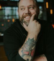 A cityscape with a real estate sign in the foreground, prominently displaying the name and phone number. Surrounding the sign are various buildings with different architectural styles, some with scaffolding and green netting. The scene features a mix of older, worn structures alongside modern glass-fronted buildings. Power lines and construction materials add to the urban complexity.